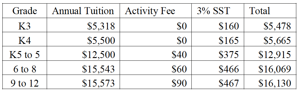 Payments can also be made in two installments, the first for 70% of the tuition by June 15th of the current school year, and the second 30% of the tuition to be paid by December 15th.